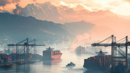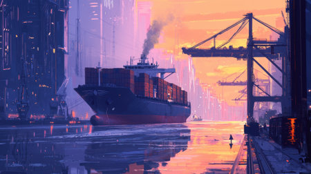 A serene evening scene showcases cargo ships navigating a busy port, with towering cranes extending into the golden horizon, creating a tranquil yet industrious atmosphere.