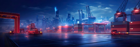 A stunning nighttime views of a bustling port, highlighting illuminated cargo ships and cranes reflected on the water, blending technology and tranquility in a vibrant industrial scene.