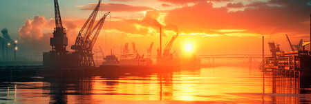 A captivating sunset view of an industrial port with cranes and cargo ships, showcasing the bustling atmosphere of transportation and trade.