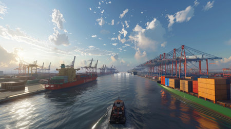 Industrial harbor scene featuring large cargo ships docked alongside cranes, with calm waterway reflecting clear blue sky, showcasing bustling activity of maritime transport and logistics