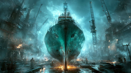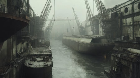 A large industrial ship looms in a foggy dockyard, surrounded by cranes and workers. The scene captures a mysterious atmosphere with reflections on the water.