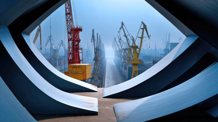 A striking view of an industrial harbor framed by sleek architecture, featuring cranes and shipping containers emerging from a mystical mist in an urban setting.