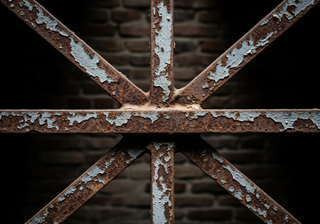 Heavily rusted steel grate showing intricate texture, corrosion, and flaking light blue paint against a dark, shadowed brick wall. focus on decay, industrial strength, and grunge aesthetic. this detailed close up emphasizes the rough surface.