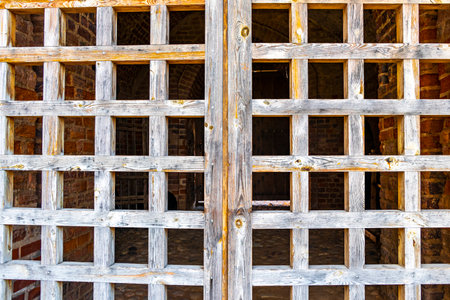 Castle wooden door gate texture with bricks in Hrodna Region Belarus.