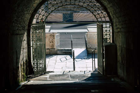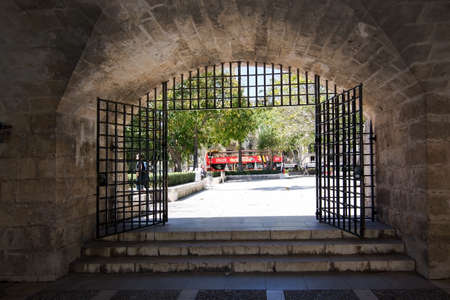 PALMA DE MALLORCA, BALEARIC ISLANDS, SPAIN - APRIL 13, 2016: Sightseeing bus seen through stone portal with grid door in Palma de Mallorca, Balearic islands, Spain on April 13, 2016.