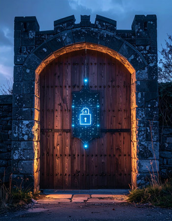 In the twilight, an ancient stone fortress stands guard, its massive wooden gate secured not by iron, but by a glowing digital lock.