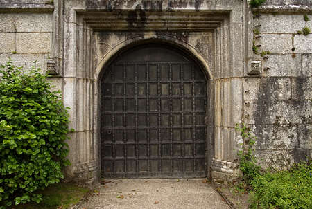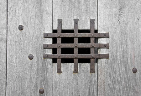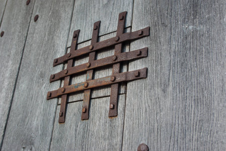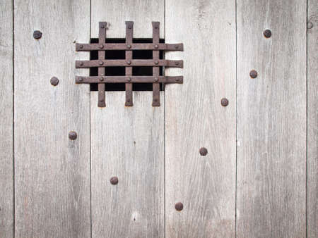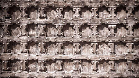 Vintage grunge wooden door gate of the old castle detail with metal rivets