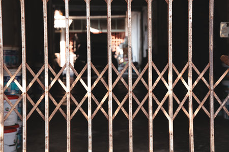 A Closed Shop displaying a Metal Grille Gate against a Dark and Shadowy Background Scene