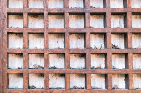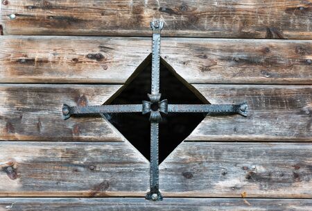 Old wooden water mill window closed with metal cross closeup in Western Carinthia, Austria