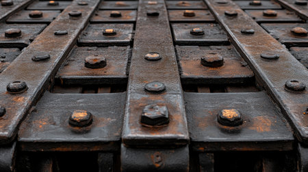 A detailed close-up of industrial metal tracks showcasing rusty textures and bolted details. Ideal for themes related to construction and machinery.