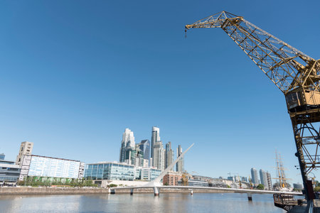 Puerto Madero, an exclusive and touristic neighborhood in Buenos Aires, Argentina: modern buildings, Puente de la Mujer bridge, Fragata ARA Presidente Sarmiento museum ship and an inactive crane
