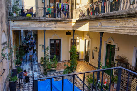 inside view of El pasaje de la defensa old house. taken from the first floor looking to the large patio surrounded by antiques and leather shops,