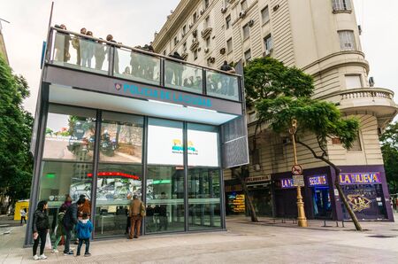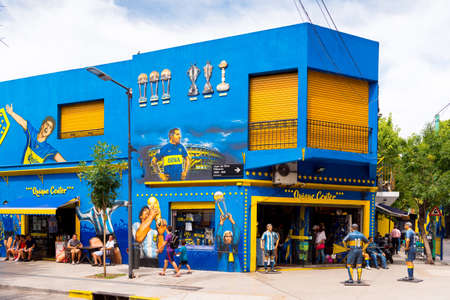 Buenos Aires, Argentina - September 05, 2018: S house with two floors with iconic argentinian celebrities represented as statues in the veranda with a shop selling souvenirs and photos in the ground floor.