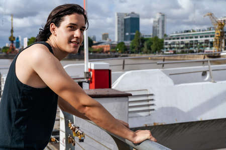 pensive man in plaza de mayo, with background of the National Historical of the Cabildo and the May Revolution Buenos Aires. young man eager to grow and learn. newcomers to the big city.