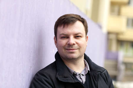 Portrait of 40 years old man, smiling male in plaid casual shirt looking at camera