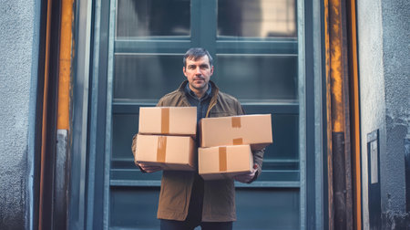 Delivery man carries boxes on a city street while wearing a cap, a serious mood makes it perfect for showing delivery services.