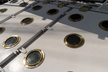 gleaming brass portholes on a sailboat hull, created with generative ai