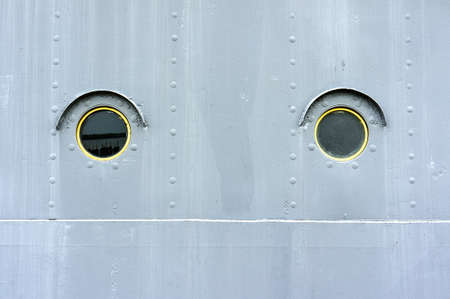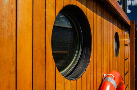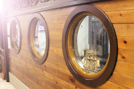 Antique round porthole in a ship's cabin. rounded porthole on an old ship.