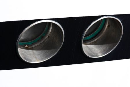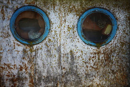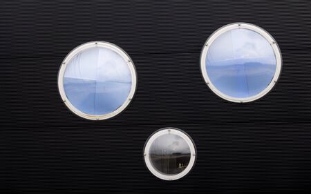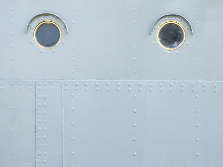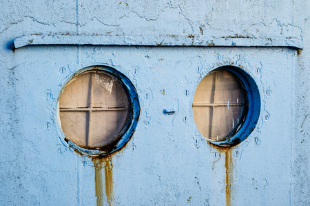 Two metal portholes with bolts on painted blue metal background. Inside view of the old aircraft.