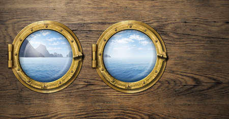 Two ship windows with tropical sea or ocean island. Travel and adventure concept.