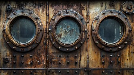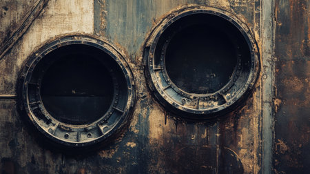 This image showcases a rusty industrial wall featuring two distinct circular portholes. The weathered metal and grunge textures create a captivating visual, ideal for artistic or urban design projects.