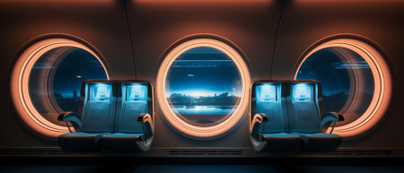 Empty aircraft seats and light shine porthole windows rendered realistically Generative AI