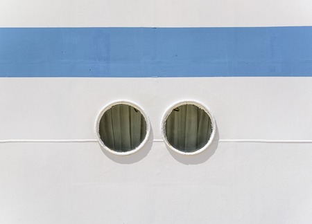 Two portholes on a wooden tall ship cabin during a bright summer day.