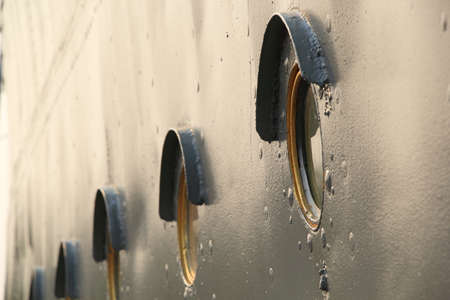 array of old ship rusty porthole or steam punk submarine or military ship window at the metal background with rivets