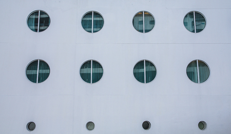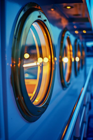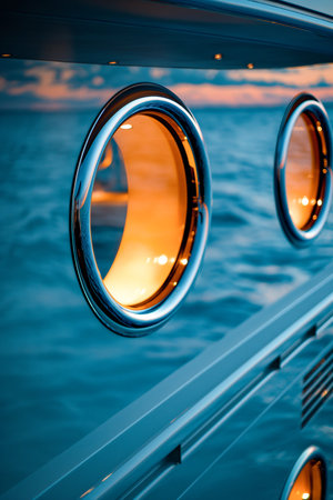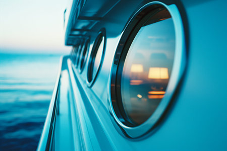 Macro close-up of yacht hull windows and metal details with a blurred sea in the background, creating a minimalistic travel-luxury atmosphere. Ideal for marine and luxury themes.