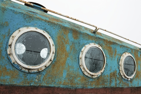 Close-up of a weathered ship door and round porthole window. Reflections of light and blurred surroundings are visible on the glass surface.