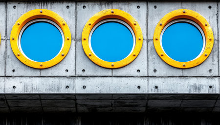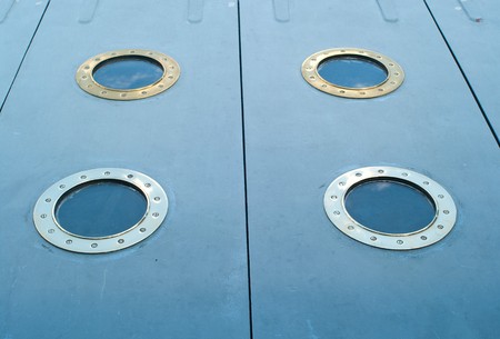 metal doors and portholes in a bunker lab or spacecraft. circular glass panes with a genuine steel frame rivets and secure door