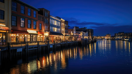 A scenic waterfront street with illuminated buildings and a waterfront view, reflecting the lights on the water and creating a tranquil, elegant atmosphere.