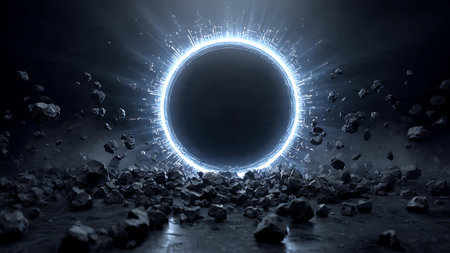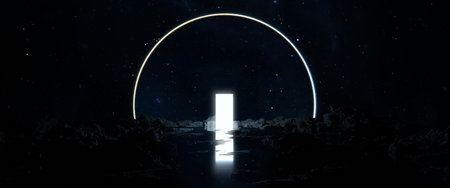 Glowing doorway portal in space on a stone planet. A door to other worlds. 3d rendering
