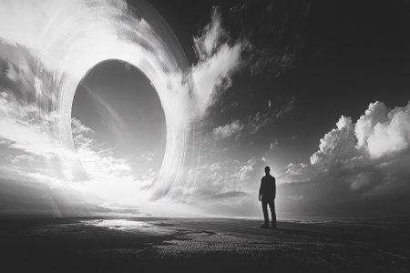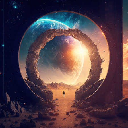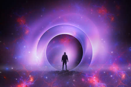 A science fiction concept. A man standing in a field looking out across space with a glowing portal in the night sky