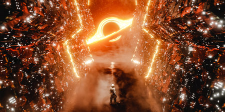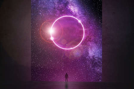 Science fiction concept. Of a figure standing in a gap in a wall. Looking at a bright glowing portal against a galaxy of stars.