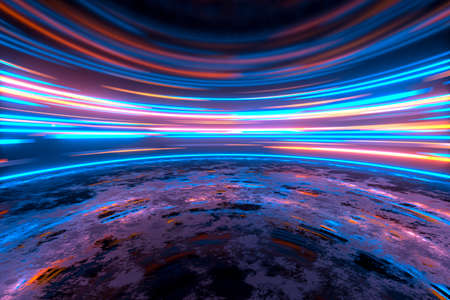 Glowing round illuminated lines in the dark round room, 3d rendering. Computer digital drawing.