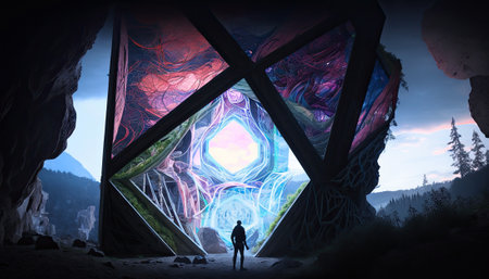 A figure in the forest and mountains stands in front of a giant colorful monument resembling an alien portal. Generative and others