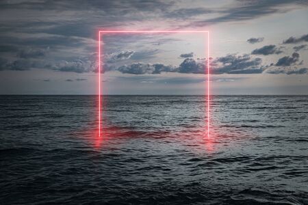 View of the calm sea in the evening, a neon frame emerging from the water, futuristic background