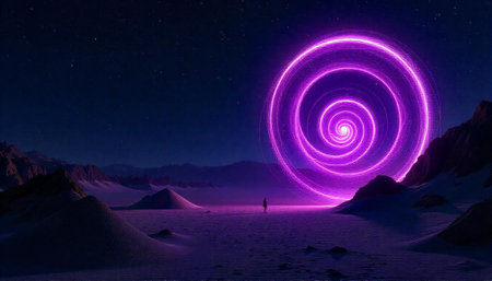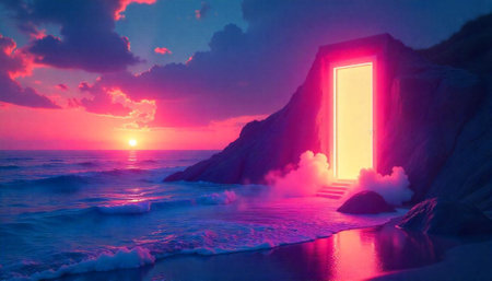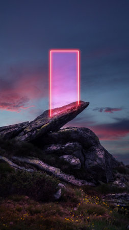 Futuristic composition. Neon pink portal on cliff edge glowing as futuristic inspiration