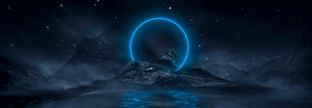 Neon landscape, night view. Futuristic fantasy night landscape with abstract landscape and island, moonlight, radiance, moon, neon. Dark natural scene with light reflection in water. Neon space galaxy portal.