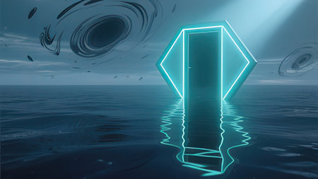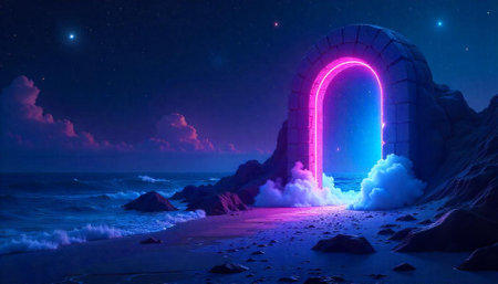 Surreal Seascape with Glowing Arches and Misty Atmosphere