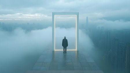 A young man stands on a bridge in the clouds in front of the passage through the magical port. Magical collage.