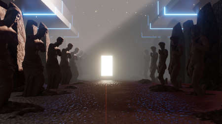 A group of people stand in a darkened cave, gazing in awe at a glowing portal. The portal appears to be a circular gateway into another dimension, a bright light emanating from its center.