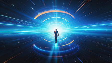 Dark abstract Sci Fi path tunnel background. Man Standing with Glowing Light Rays. 3d Rendering