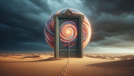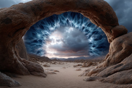 A stunning cosmic portal appears within rocky arches in a desert landscape, illuminated by vibrant clouds.