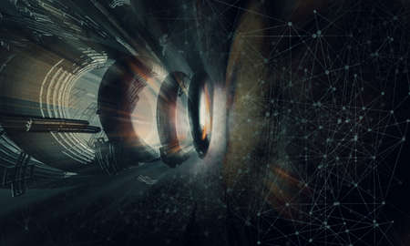 3d render of flash neon and light glowing on dark scene. Speed light tunnel through the city or urban. Technology internet of future network. Sci fiction of hyperspace interstellar travel.