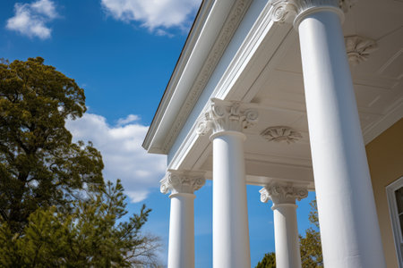 upward angle of greek revival columns on a sunny day, created with generative ai