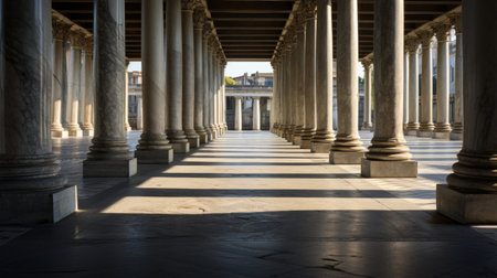 This stunning image captures a grand hallway lined with majestic columns, bathed in soft, natural light that creates a tranquil atmosphere. The intricate details of the architecture, combined with the smooth marble floor, evoke a sense of timeless elegance and invite contemplation in this serene space.