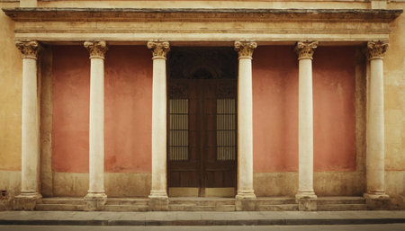 A beautiful entrance showcasing a wooden door framed by classic columns, illuminated by soft sunlight. Ideal for design and architecture themes.