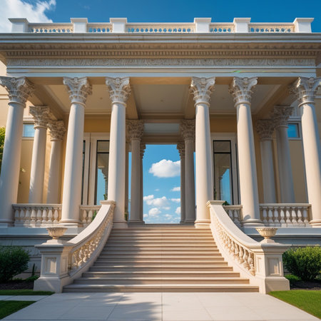 Explore the stunning facade of a historic building featuring elegant columns and intricate architectural details under a bright blue sky.